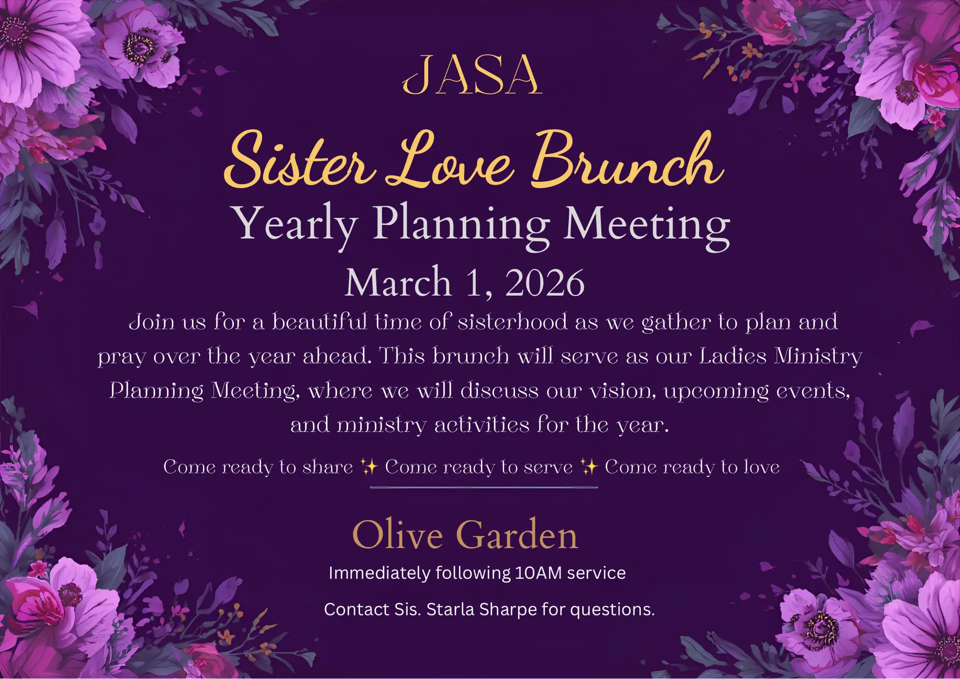 Join us for a beautiful time of sisterhood as we gather to plan and pray over the year ahead. This brunch will serve as our JASA Ladies Ministry Planning Meeting, where we will discuss our vision and theme, upcoming events, and ministry activities for the year.