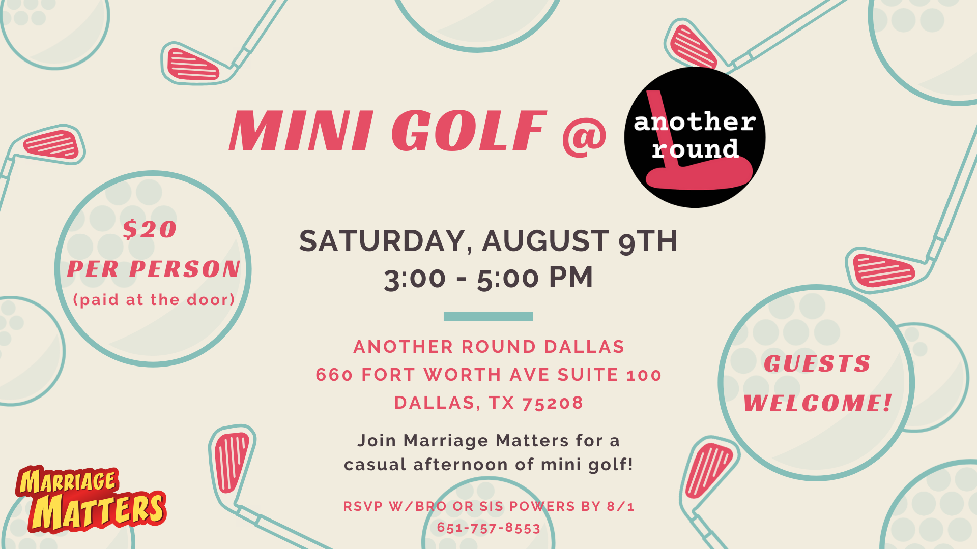 Join us for a playful and joy-filled afternoon at our Marriage Matters mini golf! Whether you're a hole-in-one pro or it's your first time holding a putter, this event is all about connection, laughter, and friendly competition. This is the perfect chance to unwind, reconnect, and strengthen your bond one putt at a time. We will meet at Another Round Dallas at 3:00 pm on Saturday, August 9th. The cost is $20 per person which can be paid at the door. Please RSVP with Bro or Sis Powers by 8/1 so we can plan accordingly. Another Round Dallas 660 Fort Worth Ave Suite 100 Dallas, TX 75208
